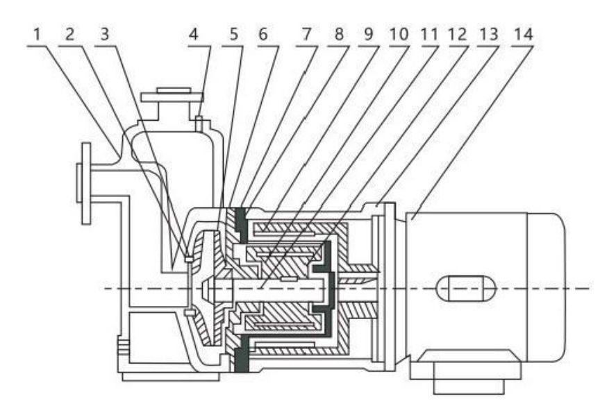 | 1 | Corpo da bomba | 5 | Impulsor | 9 | Conjunto de ímãs externos | 13 | Quadro de Conexão |
