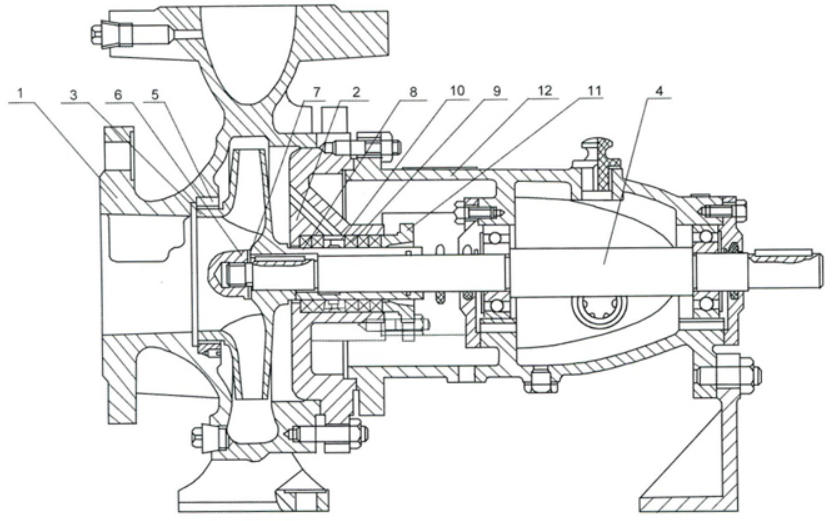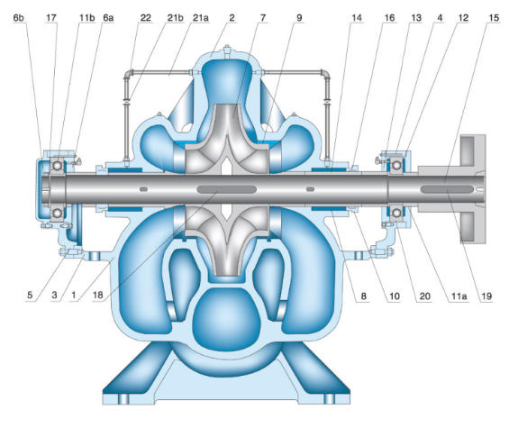- **Bomba de sucção simples**: O líquido entra no impulsor por um lado; estrutura simples, mas propensa a empuxo axial.